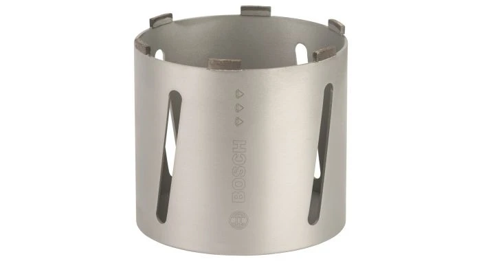 Universeel segment voor kalksteen, baksteen en zandsteen. Opmerking: voor het afzuigen Bosch-zuiger GAS 25 of GAS 50 Professional gebruiken. Zeer hoog snijvermogen en lange levensduur in metselwerk. Diamantboorkroon voor droog boren G 1/2″.